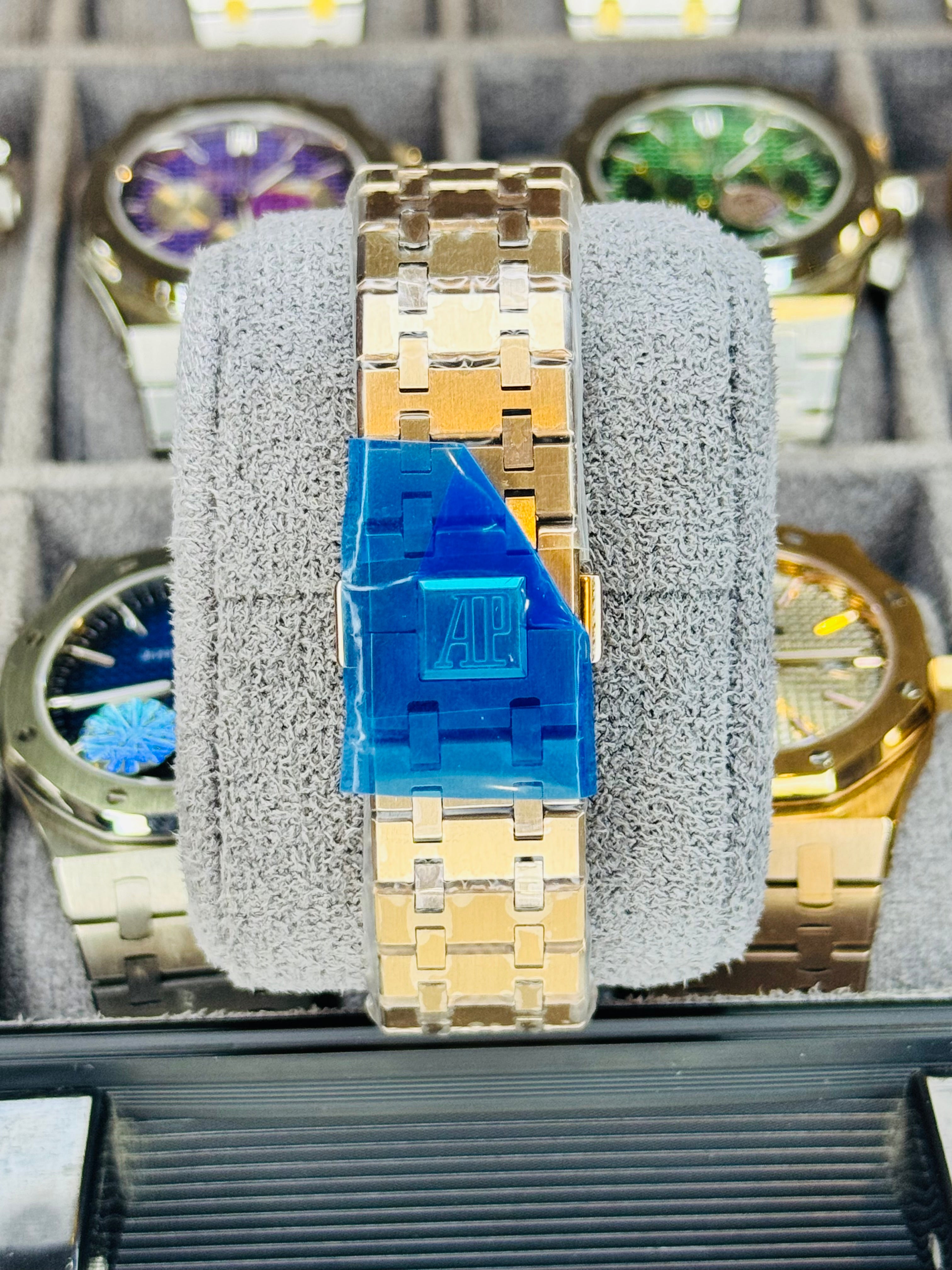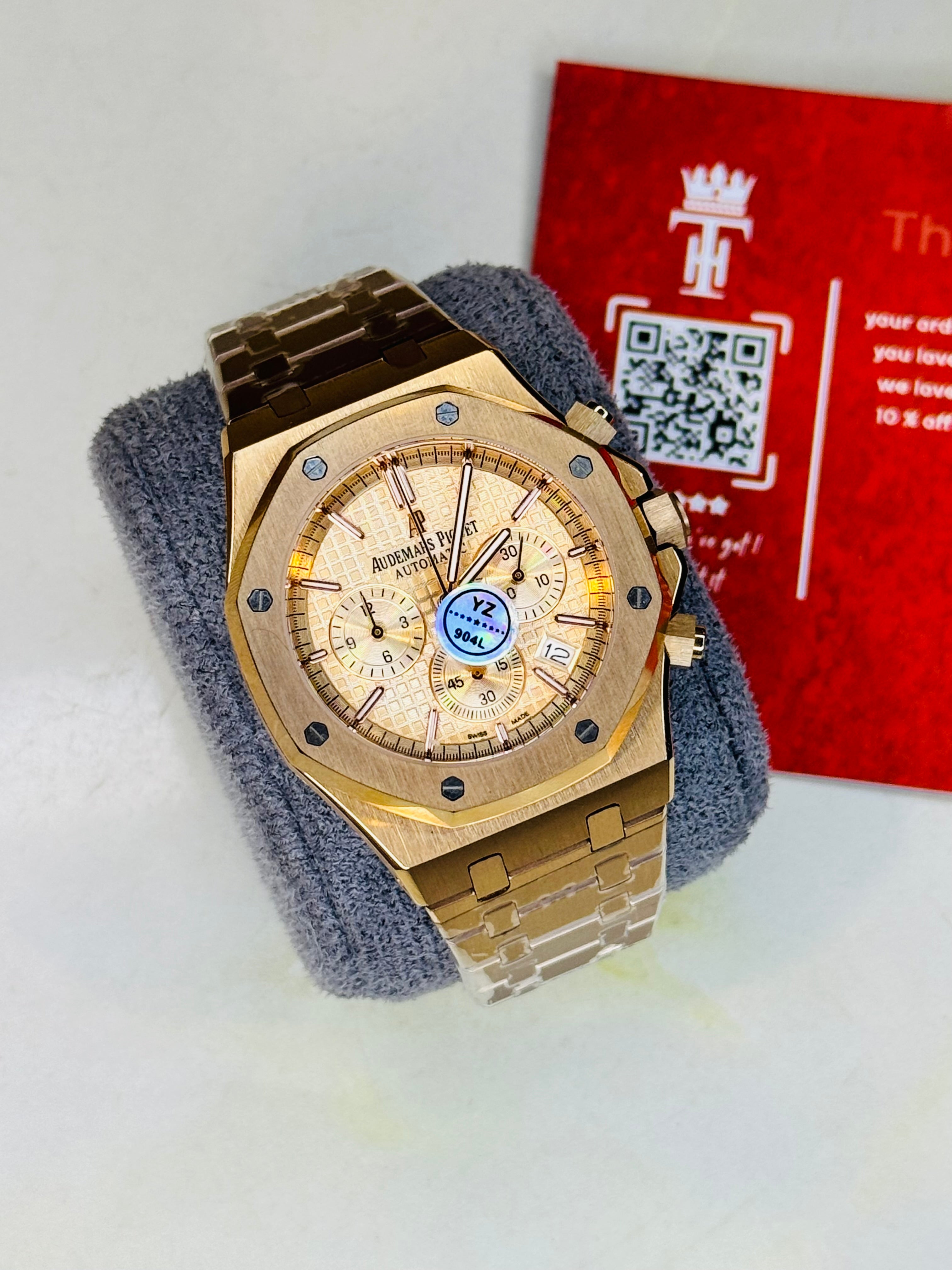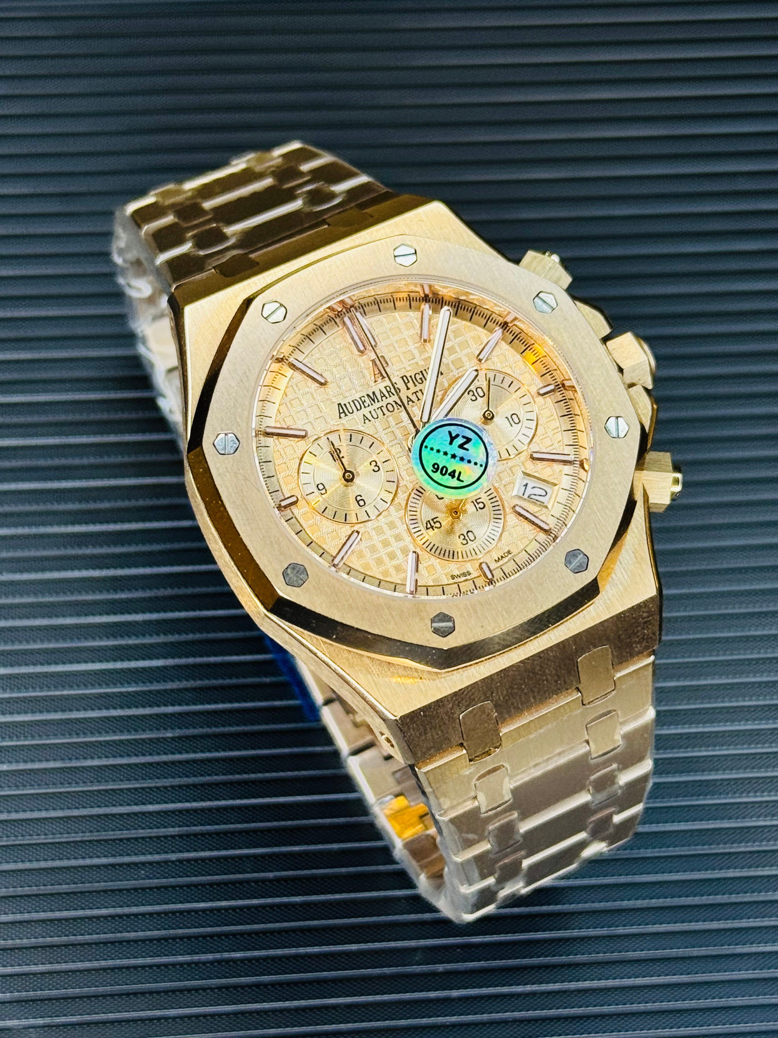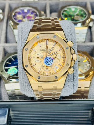 Upgrade your wrist game with this stunning AP Royal Oak Automatic Chronograph Watch, designed to combine luxury aesthetics with high-performance functionality. Featuring a bold gold-tone finish and the iconic octagonal bezel, this timepiece stands out with its sophisticated chronograph layout and premium craftsmanship.