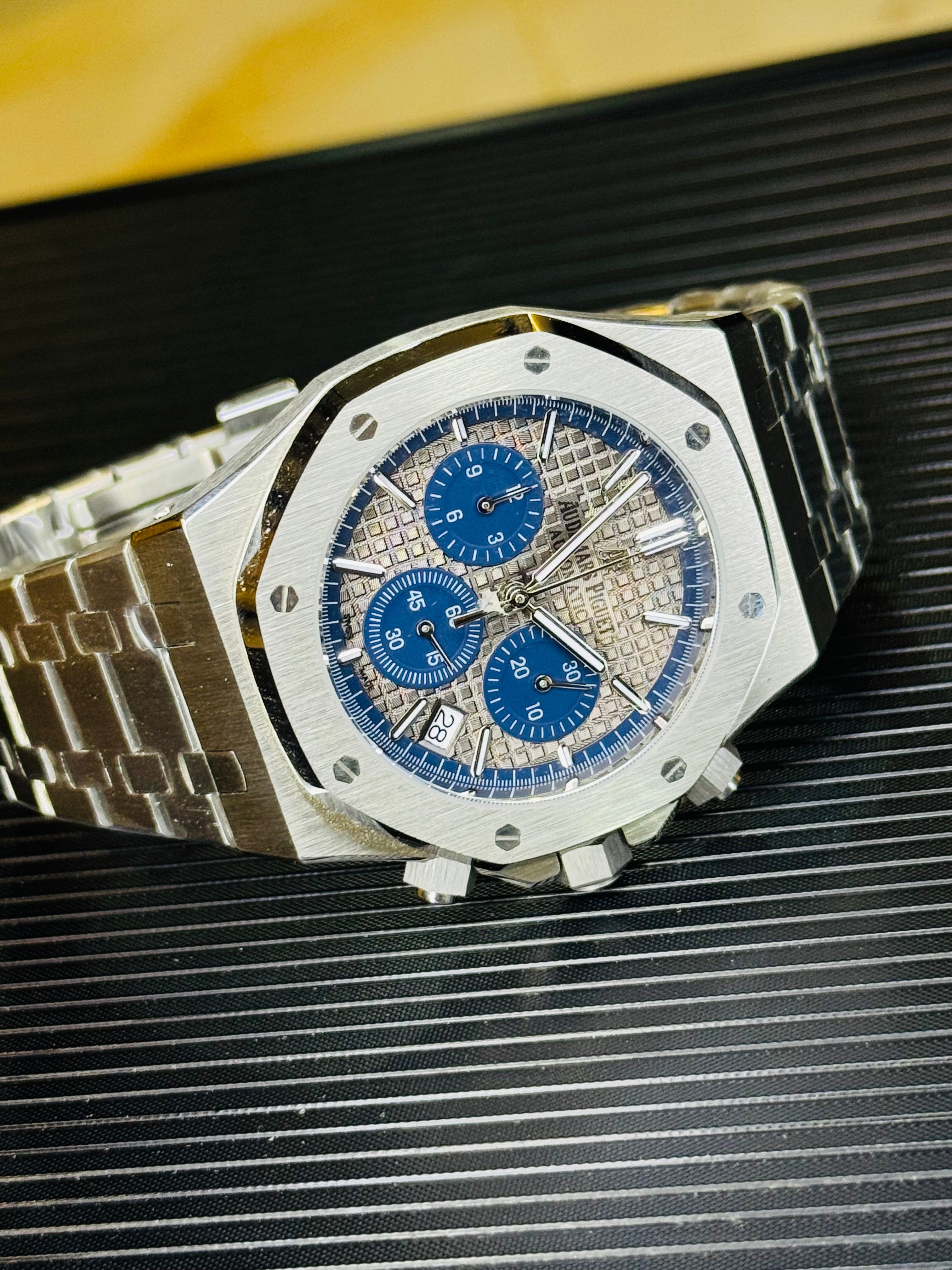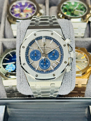 Upgrade your wrist game with this stunning AP Royal Oak Automatic Chronograph Watch, designed to combine luxury aesthetics with high-performance functionality. Featuring a bold gold-tone finish and the iconic octagonal bezel, this timepiece stands out with its sophisticated chronograph layout and premium craftsmanship.