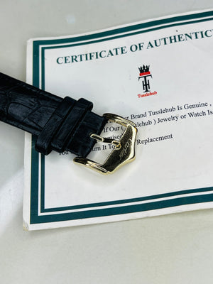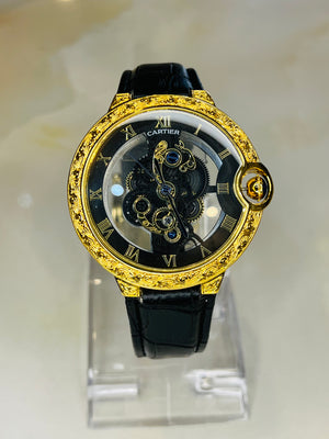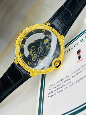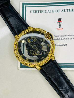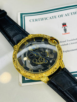 Black Gold Engraved Skeleton Dial Watch