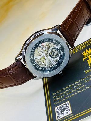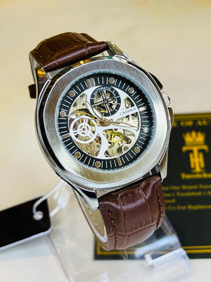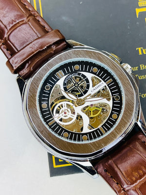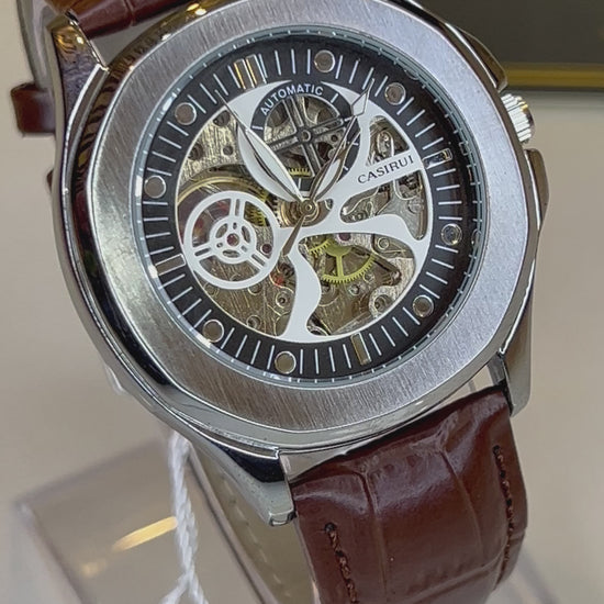 Casirui Brown Silver Automatic Skeleton Leather watch