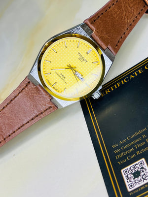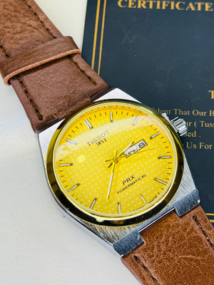 Brown Leather Strapped Tissot PRX Silver Gold Dial Watch