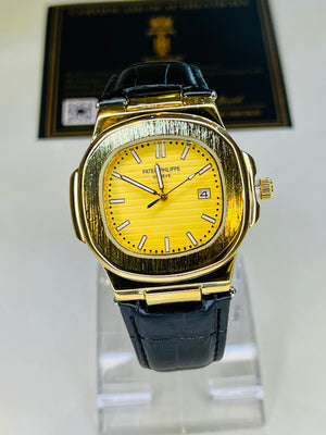 PP Black Leather Strapped Gold Nautilus Watch