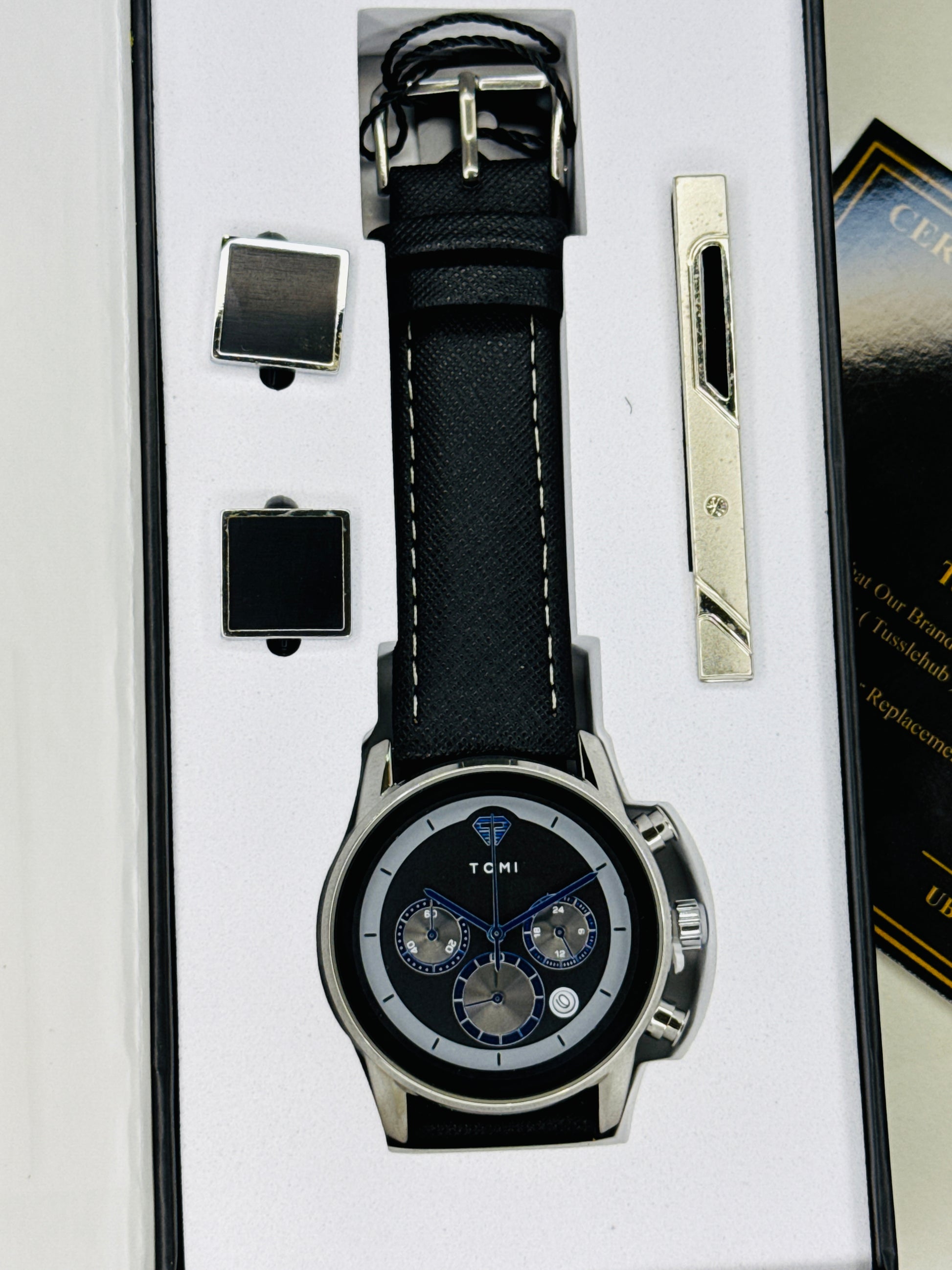 Box Includes : Tomi Watch , Tie Clip and Cuff links