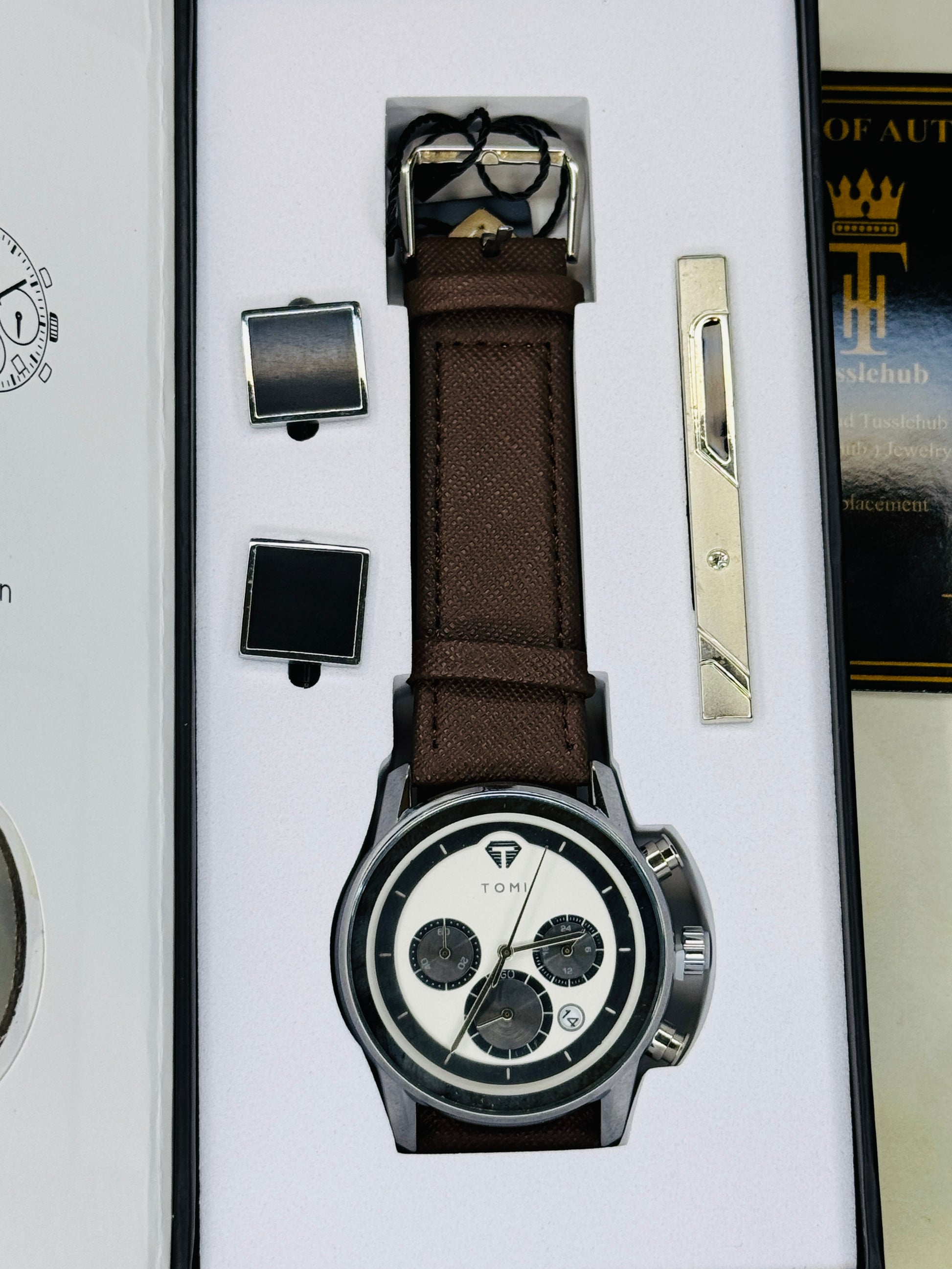 Box Includes : Tomi Watch , Tie Clip and Cuff links