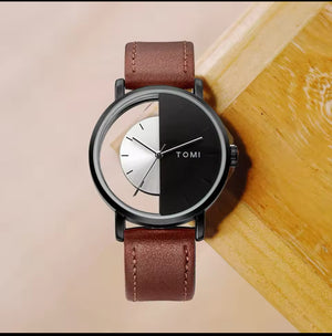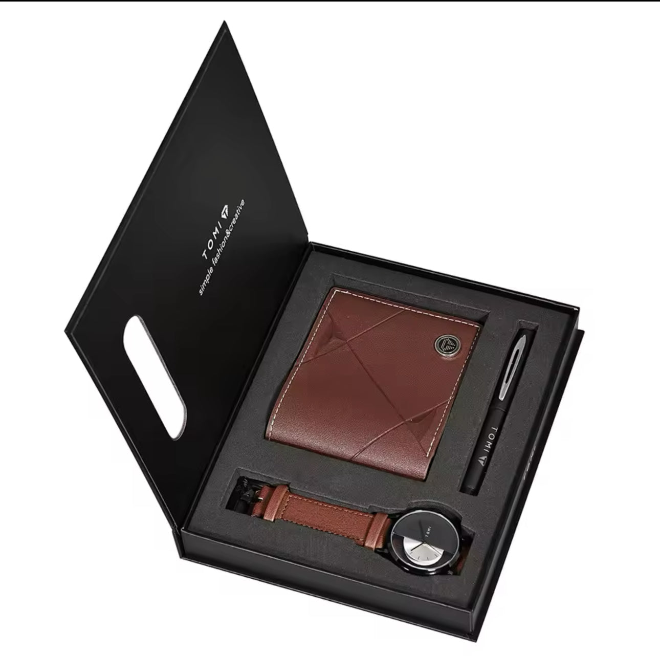 Introducing the Tomi S8 Coffee Black Half Dial Gift Set. Designed by industry experts, this gift set includes a sleek dial watch, leather wallet, pen, and watch. Perfect for any occasion, this set offers a complete package of style, functionality, and sophistication. Upgrade your accessory game with this exclusive set.